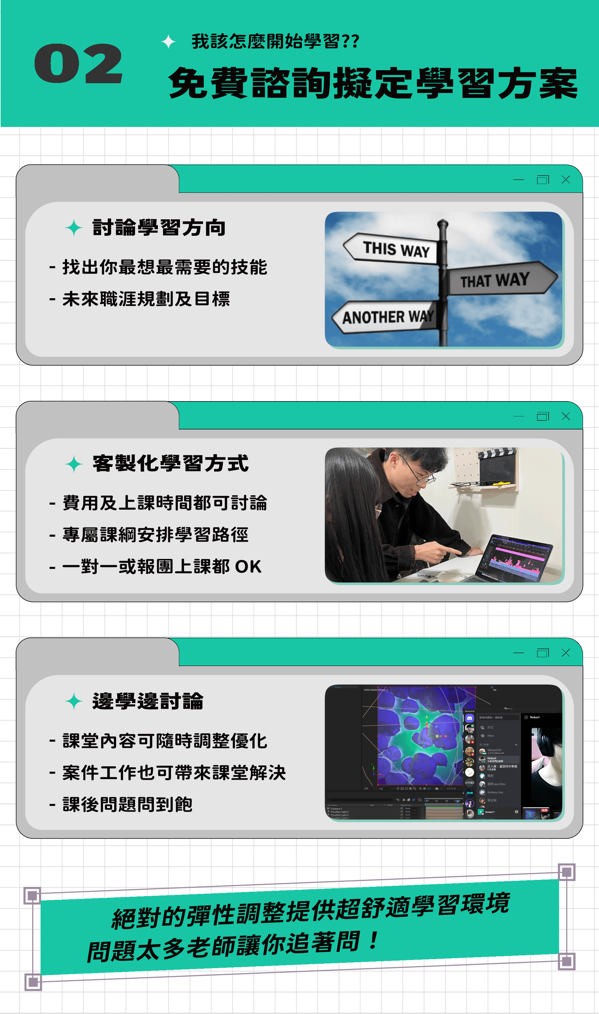 上課時會使用 Discord 也會同步螢幕錄製,以便往後複習,實作 + 複習才是成長最快的方式。