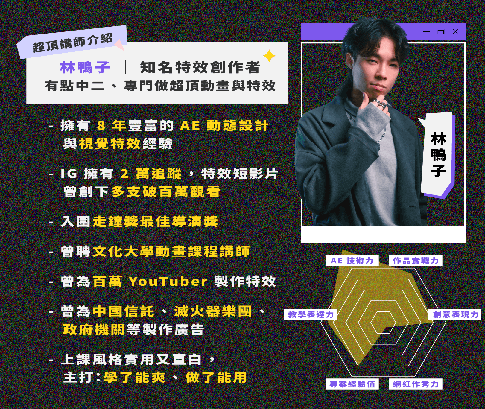 曾在百萬網紅團隊擔任影片製作人,於 2022 年開始在 IG 上經營林鴨子特效魔法師粉絲專頁,從事特效與影音剪輯製作長達 4 年,我將看似複雜的特效結合在日常的紀錄、街訪、喜劇創作當中,就是希望讓這項創作形式被更多人看見並認同,希望能用最平易近人的語言去闡述這些常人認為困難、不易嘗試的技術。