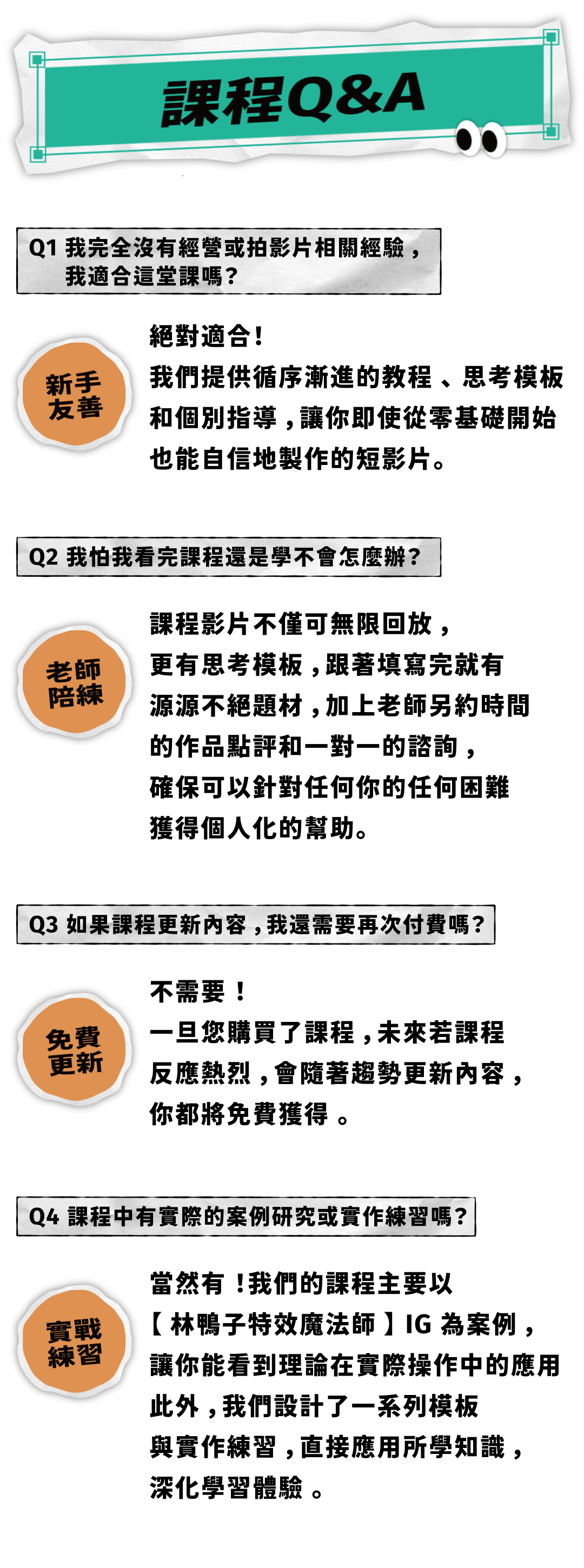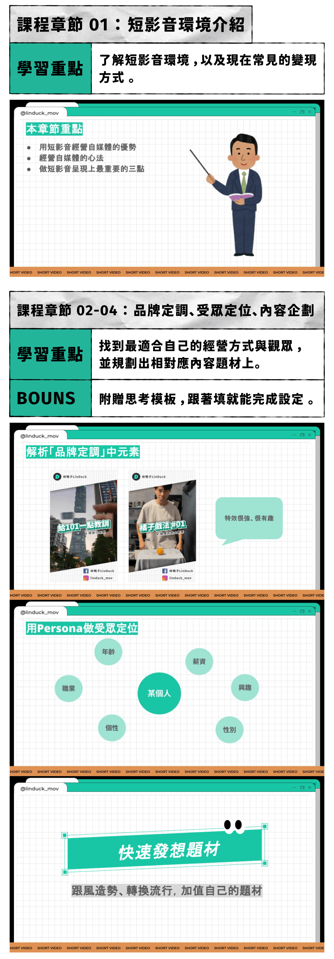 課程章節【快速發想題材】、【拍攝心法】搶先看,請大家到 課程內容 尋找試看章節10分鐘+15分鐘內容!