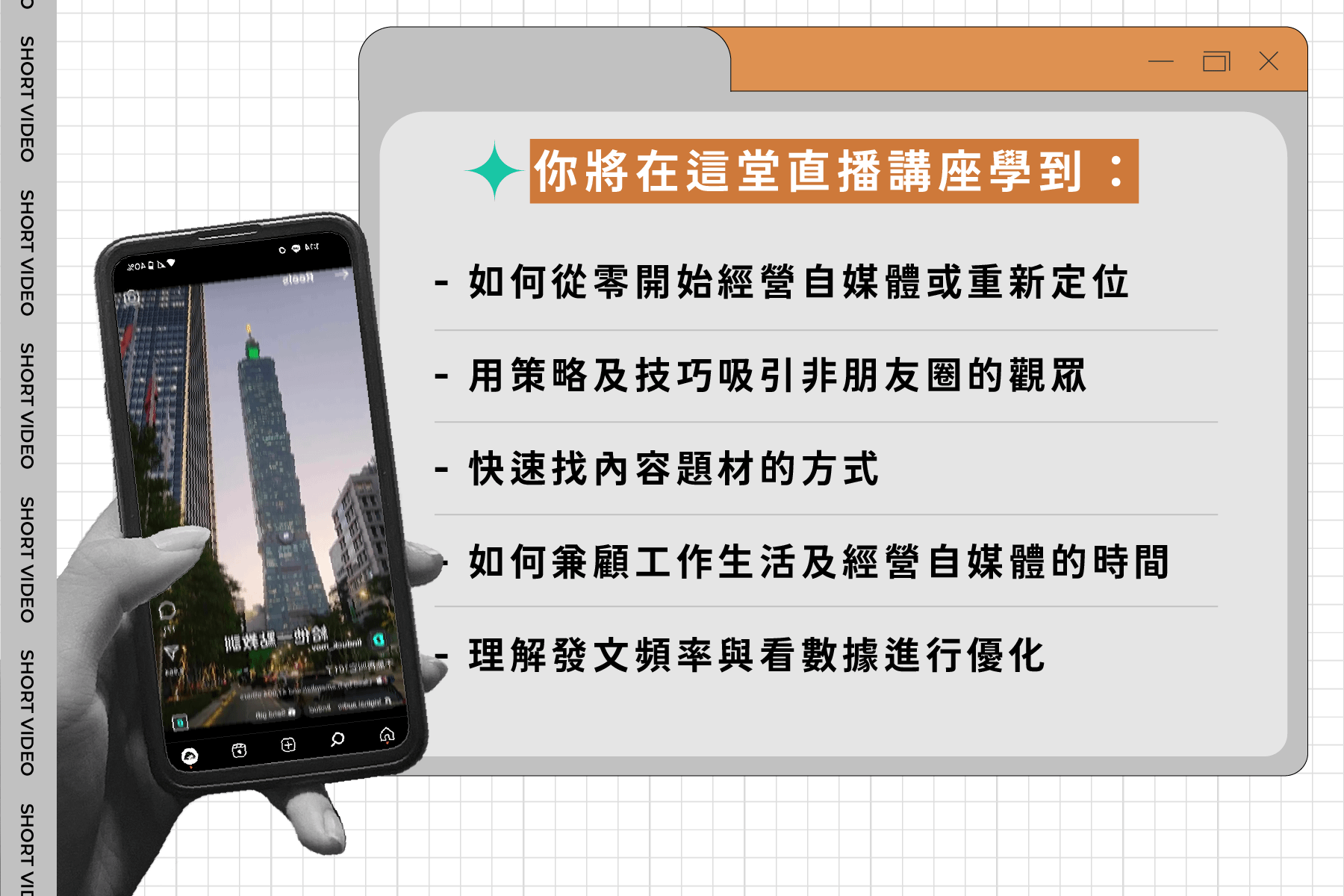 這次講座我們將會以輕鬆聊聊的方式,來解決新手在短影音經營上疑惑