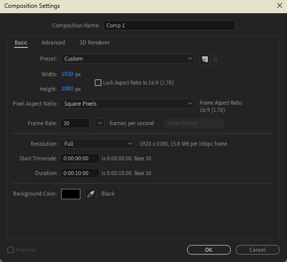 開啟 Composition 選項後, 可以調整要製作的影片尺寸(Width、Height),
