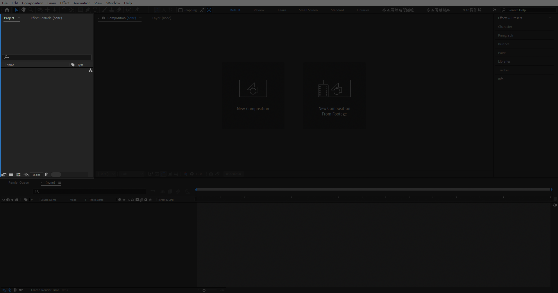 接下來需要建立一個能夠編輯的空間,稱為 Composition (簡稱 Comp),