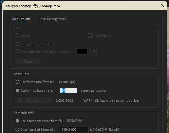 在 Conform to frame rate 將數值更改到與前兩者一致。