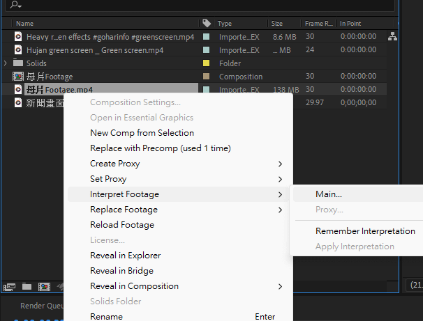 再回到 Project 視窗點擊素材右鍵 Interpret Footage > Main。