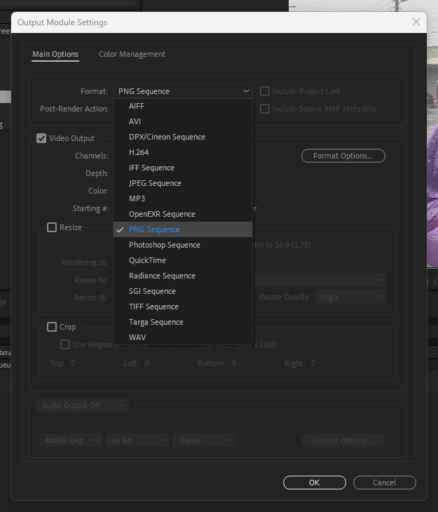 在跳出視窗內的 Format 選擇輸出格式為 PNG Sequence。