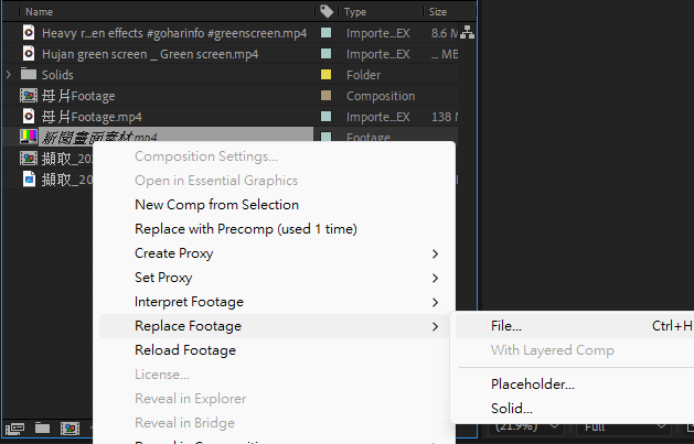 準備好素材檔案之後到 Project 視窗對素材右鍵 > Replace Footage > File,