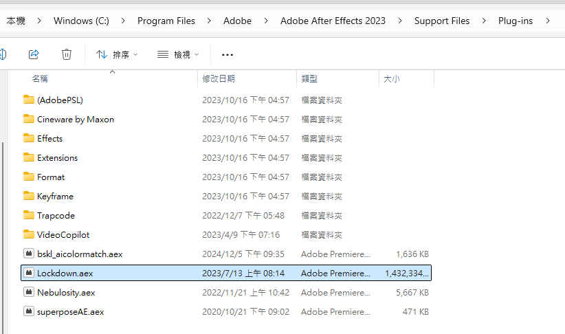 將 Plug-in 插件檔案複製起來(通常是 .aex 檔),移動到到以下路徑:
