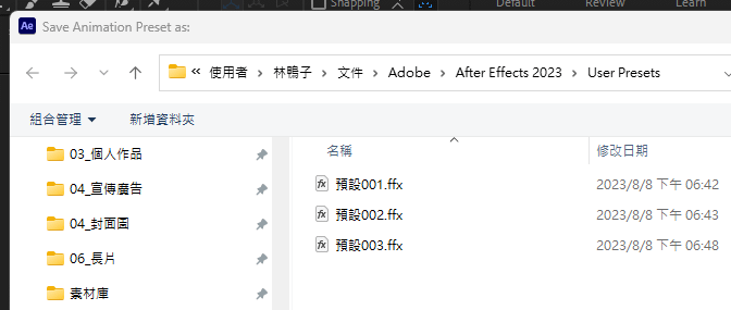 將 Preset 預設檔案複製起來(通常是 .ffx 檔),移動到到以下路徑: