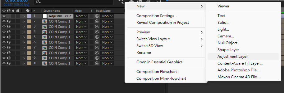 最後你還可以在硬幣的 Comp 內新增一個 Adjustment Layer,