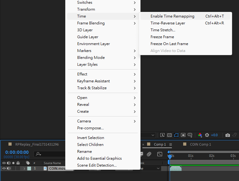 對去背好的硬幣圖層右鍵 > Time > Enable Time Remapping。