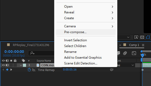 對延長完的硬幣圖層右鍵 > Pre-compose。
