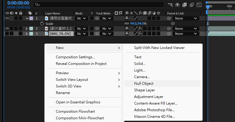 追蹤完畢之後關閉 Mocha AE,並在圖層空白區新增 Null Object。