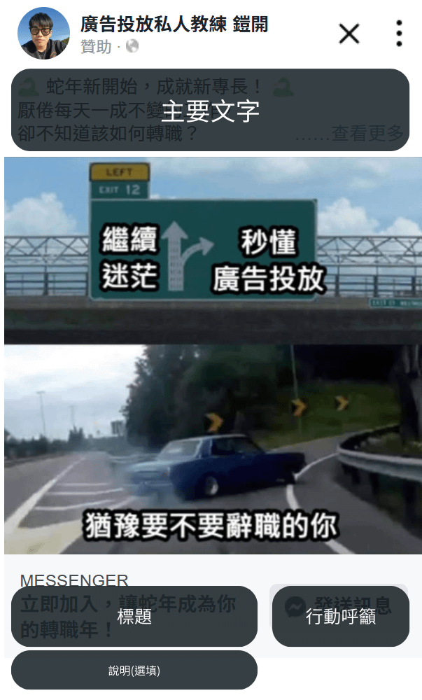 - 【主要文案】、【標題】、【說明】、【行動呼籲】的廣告呈現位置如下圖。