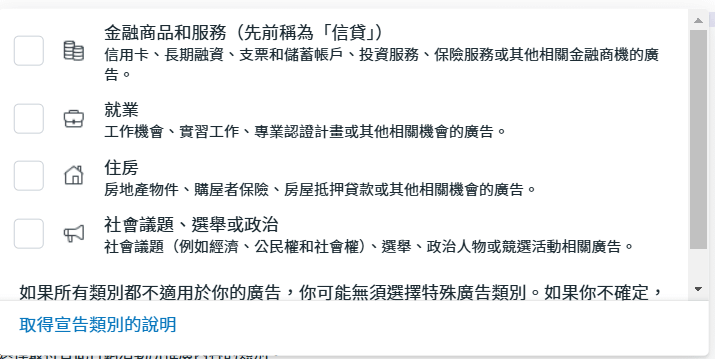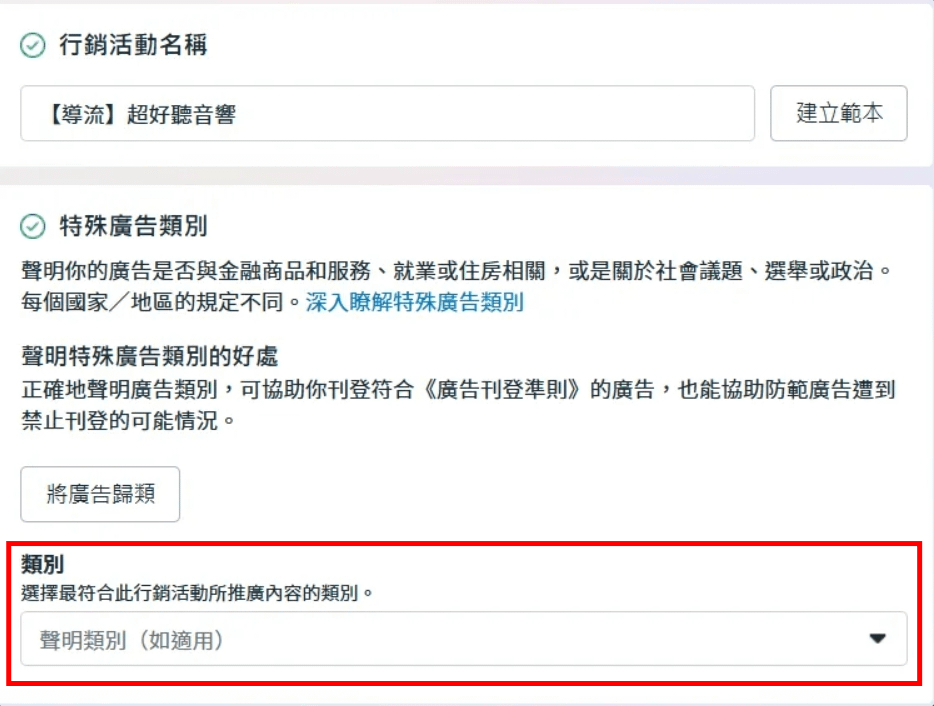 若你是特殊廣告類別,記得要也先到廣告管理員的行銷活動中選取聲明。