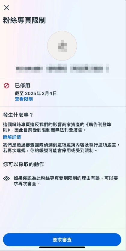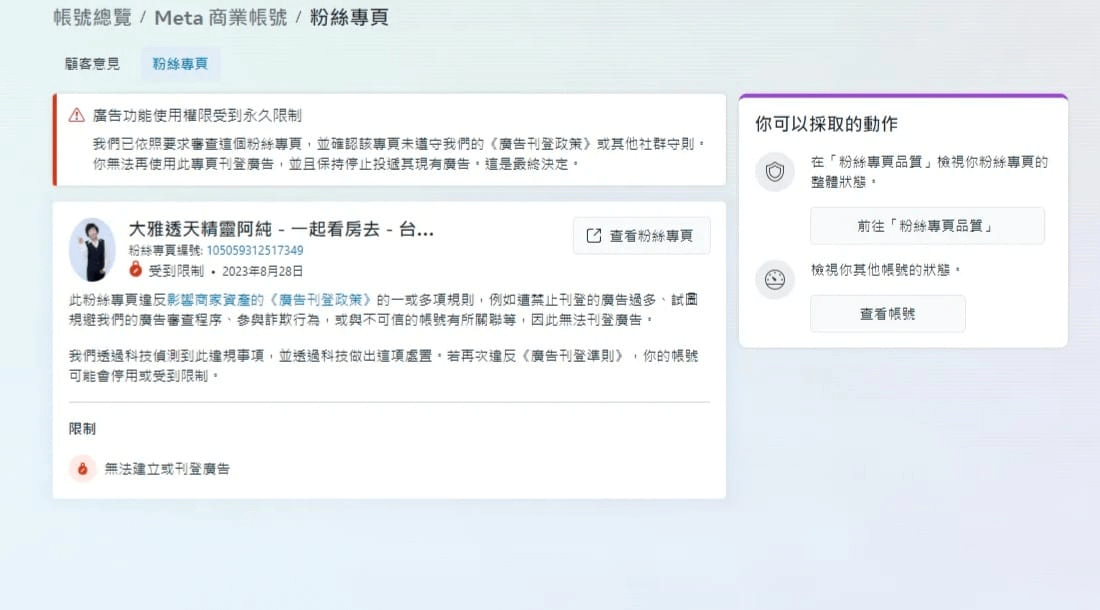 - 粉絲專頁曾被舉報,導致 Meta 限制其廣告功能