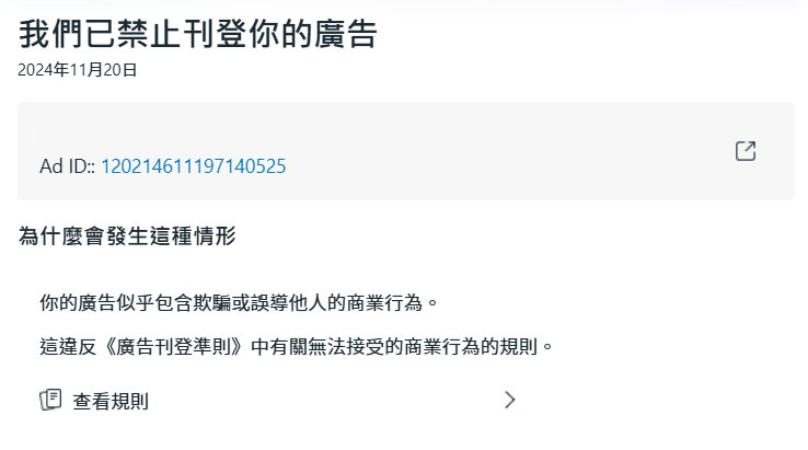 - 多次違反廣告政策(例如:持續刊登違規內容)