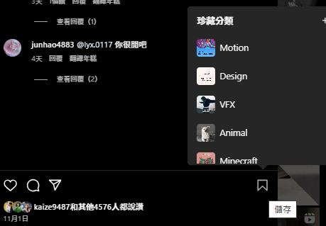可以多多善用儲存功能,以 Instagram 為例,這邊使用儲存按鈕。