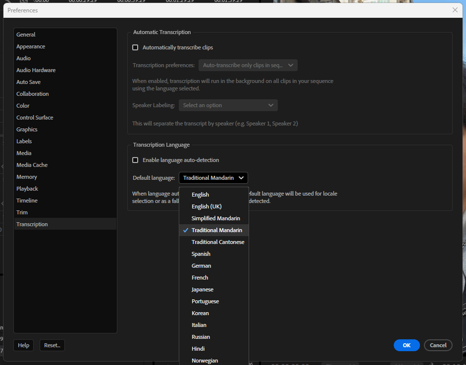 在使用自動自目前需要到 Edit > Preferences > Transcription 設定。