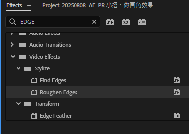 使用 PR 則在 Effects 視窗搜尋 Roughen Edge 效果。