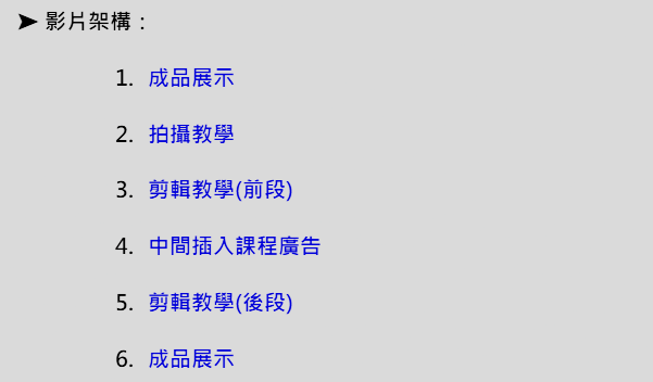 6. 成品展示:最後再放一次成品,這六個段落就是組成這支影片的架構了。